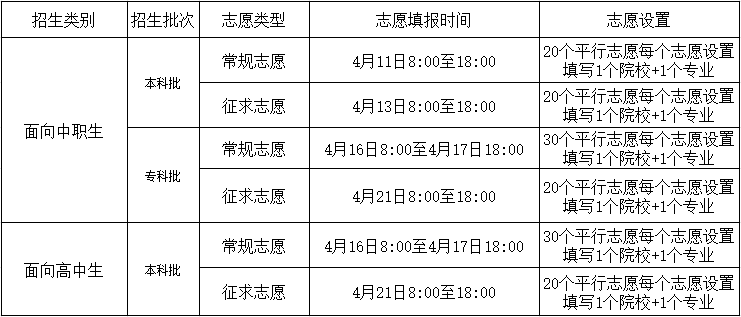 1. 高職(專科)批次的常規志愿填報時間為4月16日8:00至4月17日18:00;征求志愿填報時間為4月21日8:00至18:00。