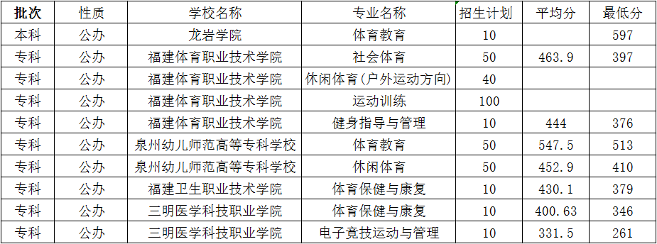 2023年福建高職分類考試體育類專業錄取分數線: