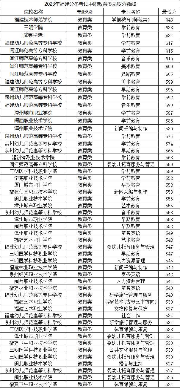 2023年福建分類考試中職教育類錄取分數線: