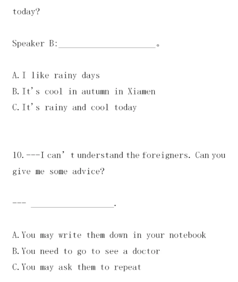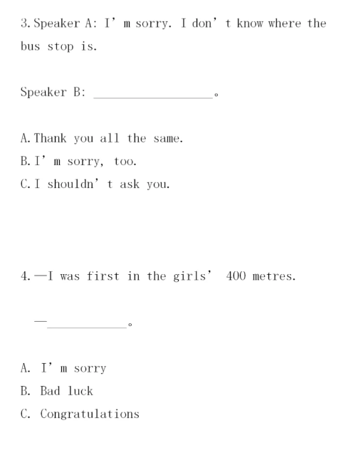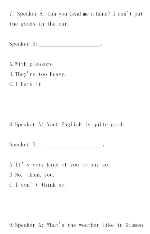 導讀:福建高職招考英語情景交際用語練習見下文,情景對話題不同于語法選擇題,語法上正確的、漢語上講得通的不一定是正確答案。情景對話的正確回答必須遵循“委婉、客氣、禮貌”的原則,被詢問者要根據實際情況作出回答。