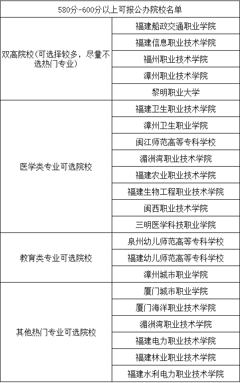 一、福建分類考試580分-600分可報公辦院校名單: