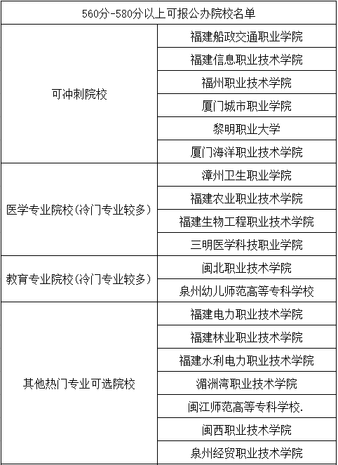 一、福建分類考試560分-580分以上可報公辦院校名單: