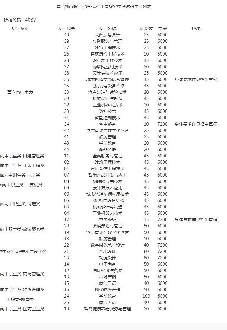 以上就是2021年廈門城市職業學院高職分類招考招生計劃的全部內容,更多關于福建高職分類考試的相關內容,如于福建高職報考條件、報名時間、考試科目、于福建高職成績查詢、分數線等敬請關注福建高職分類考試網。