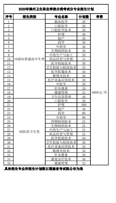 2020年漳州衛生職業學院分類考試分專業招生計劃