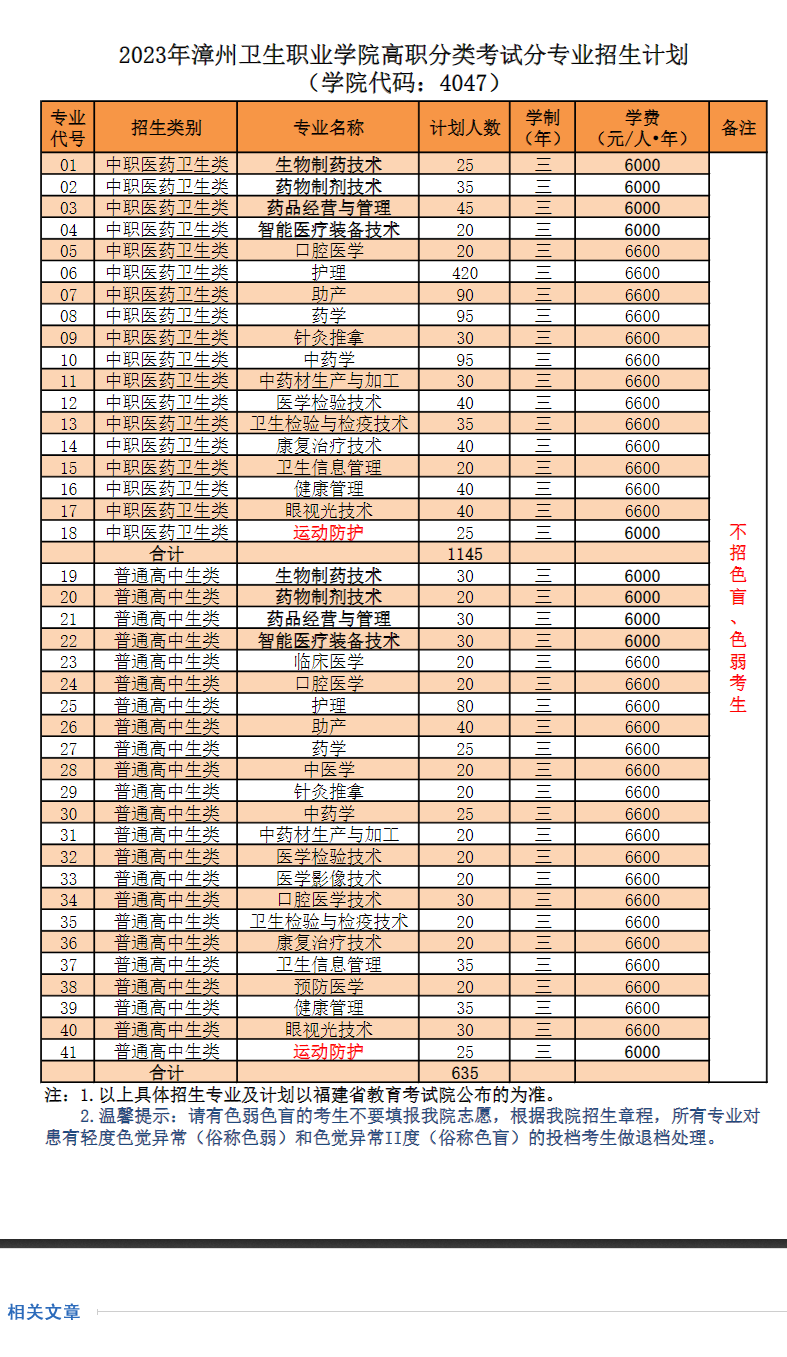 以上就是2023年漳州衛生職業學院高職分類考試分專業招生計劃全部內容,更多關于福建高職分類考試的相關內容,如于福建高職報考條件、報名時間、考試科目、于福建高職成績查詢、分數線等敬請關注福建高職分類考試網。