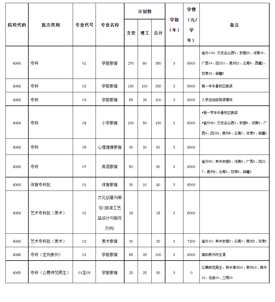 泉州幼兒師范高等專科學校2018年夏季分專業招生計劃