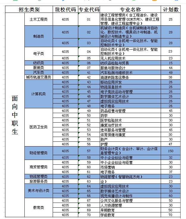 經福建省教育廳核準,我校2020面向福建省高職院校分類考試共安排招生計劃2050人,其中面向中職畢業生計劃1364人,分專業招生計劃如下表,歡迎廣大考生選報我校各專業!
